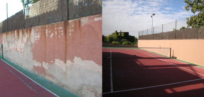 Picado y retirada manual, de todo el mortero aplicado en los paramentos perimetrales a la pista de tenis.